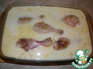 Влить горячий куриный бульон, 250 мл. молока, посолить и поперчить. Перемешать.
