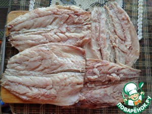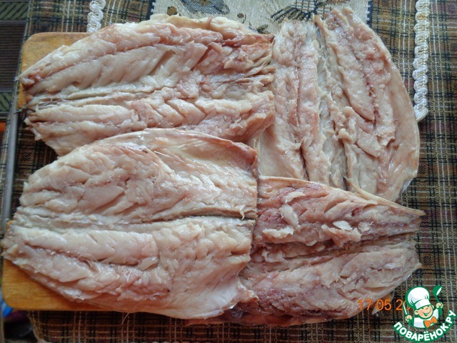 У скумбрии удалим хребет и кости. Распластаем филе на коже.