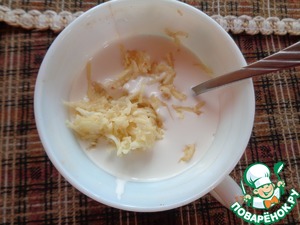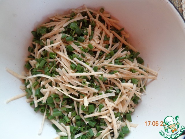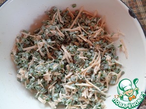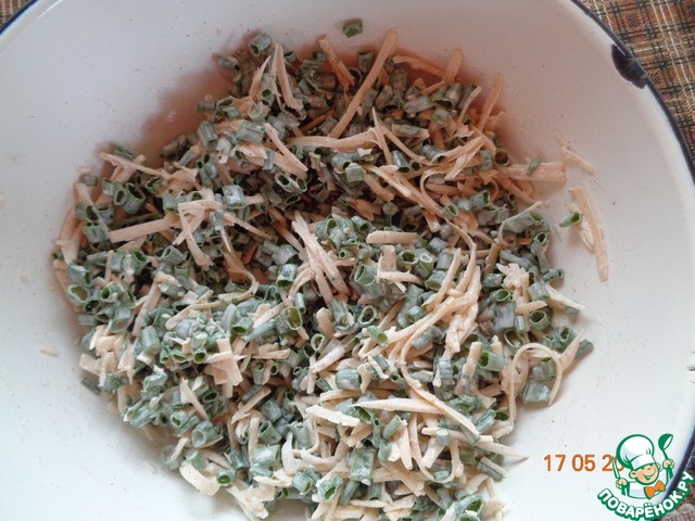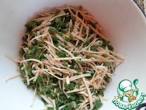 Приготовим начинку для фаршировки скумбрии: сыр нашинкуем на крупной терке, зеленый лук батун мелко порежем, добавим приправу, все перемешаем.