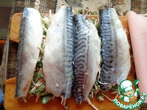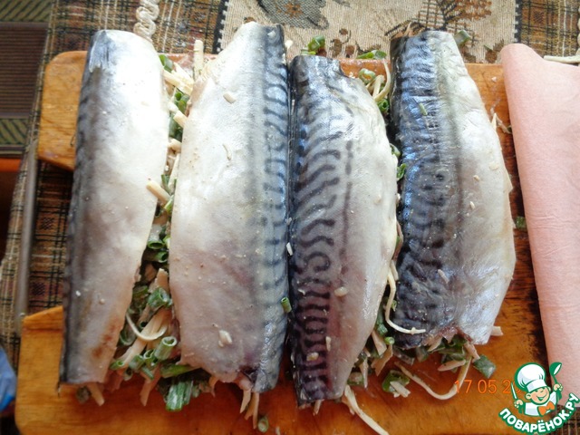 Разогреем духовку до 180 градусов. Филе скумбрии нафаршируем начинкой и сложим пополам (получится целая рыбка).