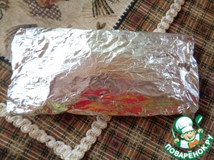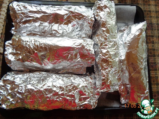 Конверты с фаршированной скумбрией перенесем на противень. Выпекаем в духовке при температуре 180 градусов 30 минут.