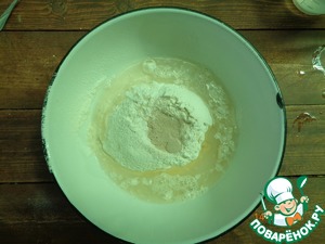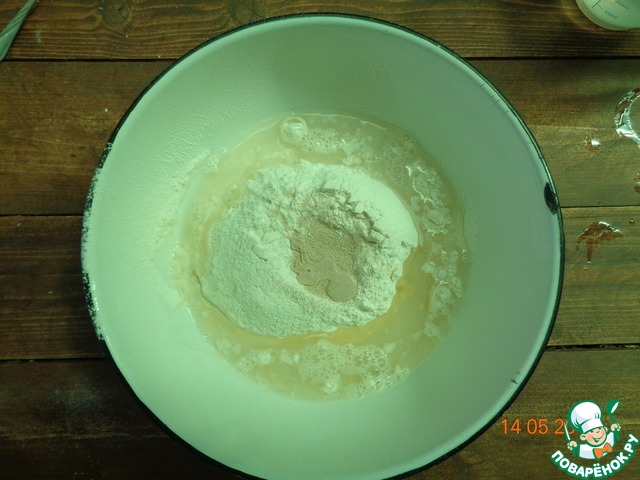 Для приготовления теста смешаем все ингредиенты: муку, соль, сахар, дрожжи, растительное масло, воду.