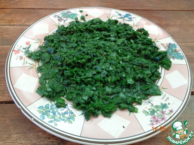Приготовим начинку: зеленый лук батун (можно использовать любой зеленый лук) перебрать, помыть, обсушить и мелко порезать, посолить.
