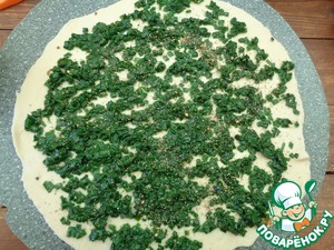 Равномерно распределим начинку из лука батуна, ароматизируем приправой, черным молотым перцем, посолим.