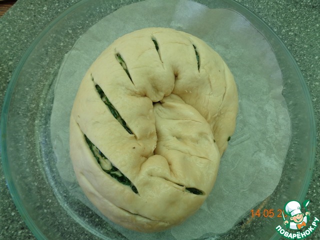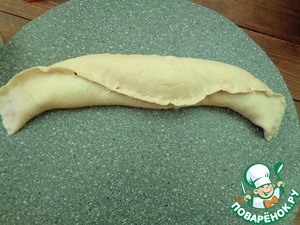 Сформируем булку: один конец направим в центр, другой заправим под сформированную булку. Ножом сделаем неглубокие надрезы по всей поверхности.