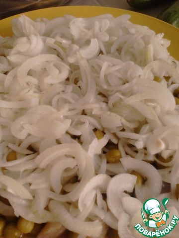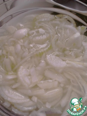 В первую очередь замаринуем лук. Накрошим его тонкими полукольцами и зальем стаканом 6% уксуса Уксус можно слегка развести водой, это на ваш вкус, нам нравится так. Оставим на 30 минут (или дольше, если есть время)