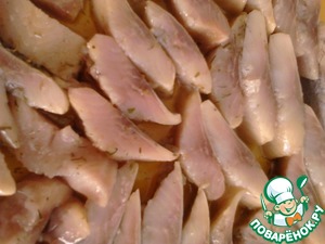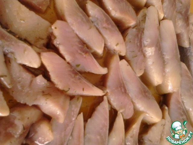 Лук откинуть на сито, чтоб стек весь маринад и тоже переложить к рыбе.