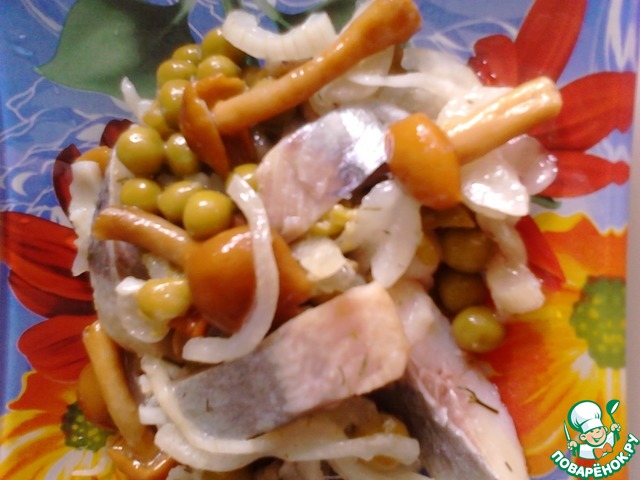 Опята маринованные промыть под холодной водой и добавить к салату.