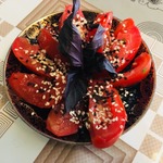 Tahinli domates salatasi - очень вкусный салат турецкой кухни. Очень простой в приготовлении салат-закуска. Помидоры гармонично сочетаются с кунжутно-чесночной заправкой и добавлением лимона.