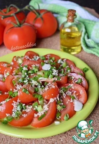 Зеленый лук нарезать и посыпать сверху на помидоры.