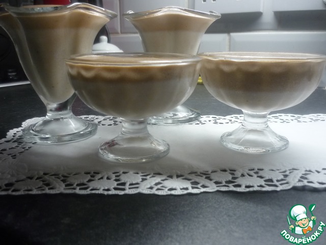 Я разделила получившуюся массу на две части, разлила светлую часть по креманкам, добавила в оставшуюся часть кофе и взбила венчиком. Разлила кофейную поверх светлой. -