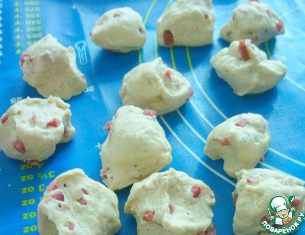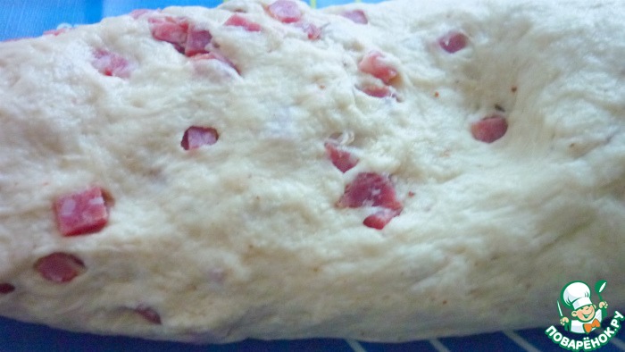Колбасу режем мелким кубиком и вмешиваем в тесто. -