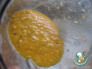 Помещаем в блендер очищенные апельсины, сахар и крахмал. И взбиваем до однородности. (Я ещё добавила 2 ст.ложки облепихового варенья, что придало очень пикантный вкус)