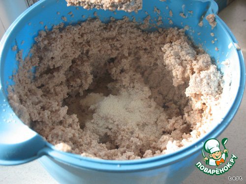 Растираем до гладкой смеси творог, размягченное масло и сахар. Подмешиваем крахмал и манную крупу.