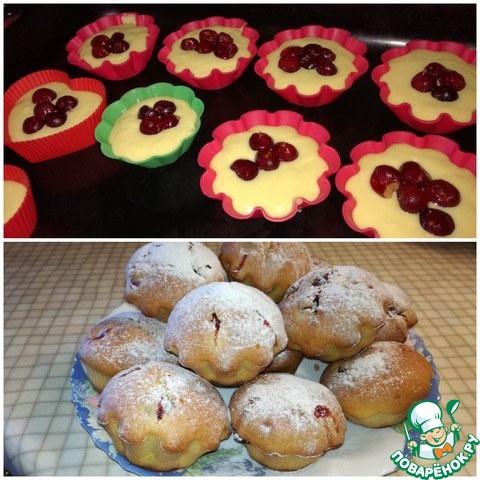 Наполнить формы тестом на 1/3, положить в каждую вишни 1-2-3 шт.