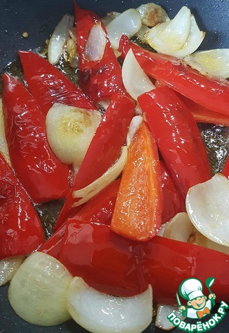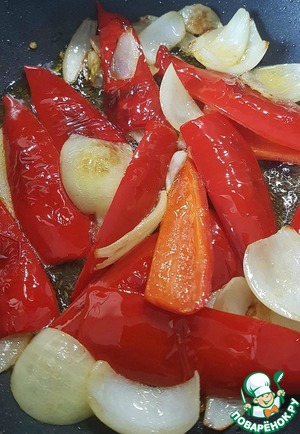 Лук нарезать крупно, перец так же. Обжарить на сильном огне, помешивая, около 1 минуты. Убрать со сковороды.