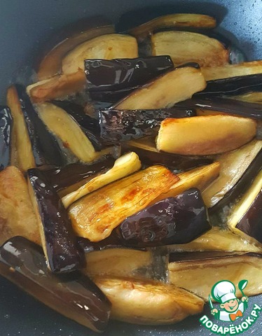 В том же масле обжарить баклажаны, нарезанные брусочками. Убрать на салфетки, чтоб избавиться от излишков масла.