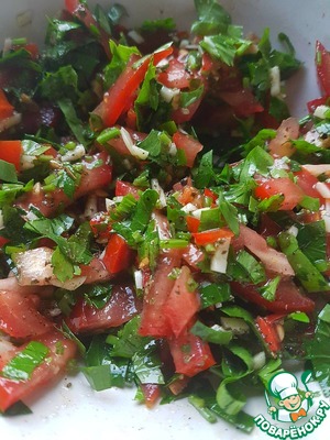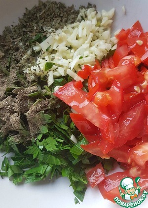 Приготовить заправку. Петрушку и чеснок нарезать мелко, помидоры тонкими ломтиками, добавить перец душистый, сухой базилик, масло оливковое (по желанию), соль и сахар.