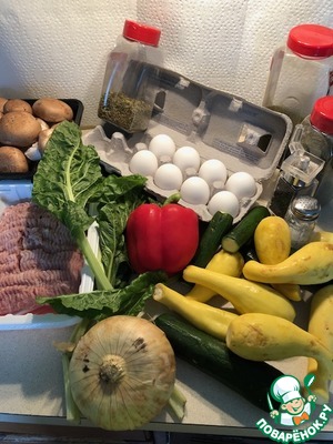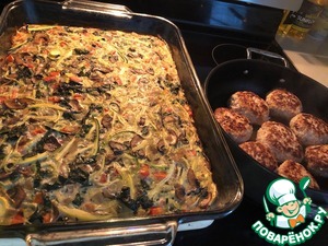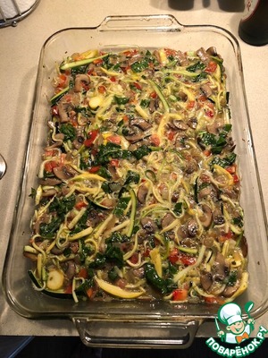 Наконец, собираем подготовленные ингредиенты кассероля вместе в большой миске, типа салатница или у кого что есть подходящее. Вливаем три-четверти яичной смеси в овощи, перемешиваем, выкладываем в стеклянную огнеупорную миску. Выравниваем, у меня получилось сантиметра 3 по толщине - идеально. Доливаем остатки яиц, размазываем - отправляем в духовку на 20-ть минут. Хух. Отмучились. Это был самый трудоемкий этап, где ни секунды покоя. Дальше все легко и приятно.