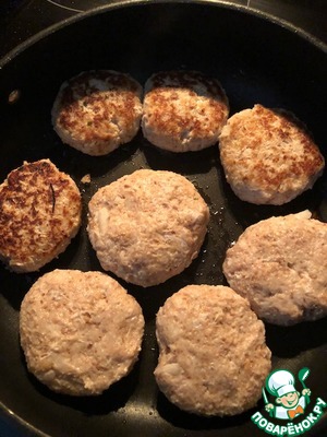 Формируем котлеты и жарим, понятно, без фанатизма. Все умеют. Я руки смачиваю в миске с водой, чтоб фарш не лип. Получается у меня 8-9 штук из полкило. В зависимости от жадности. После обжарки убавляю "огонь", подливаю немного воды, накрываю крышкой и парю до момента готовности кассероля.