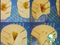 Плетем до конца надрезов. Оборачиваем оставшиеся хвостики вокруг булочки и соединяем. Получаем вот такую булочку. Смазываем желтком пополам с водой. |