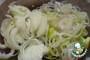 Лук-порей нарезать кольцами, репчатый полукольцами.