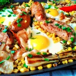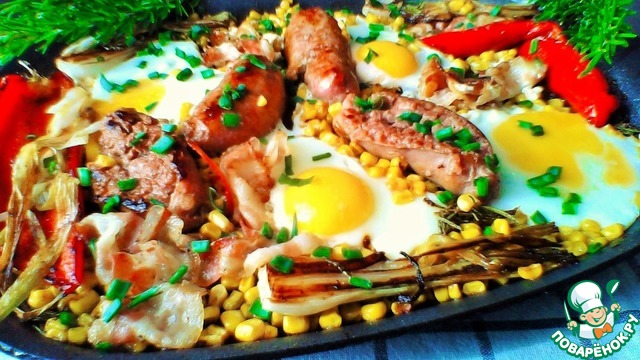 Чудесный рецепт яичницы, которую мы приготовили! Свежие деревенские яйца, зеленый лук с огорода, колбаски и бекон станут основой вкусного блюда. Острый перец и кукуруза отличное дополнение к нашему блюду. Не забудьте о них!