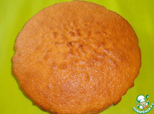 Тесто выливаем в форму. Выпекаем корж в духовке при температуре 180 градусов 30 минут. Остужаем бисквит.
