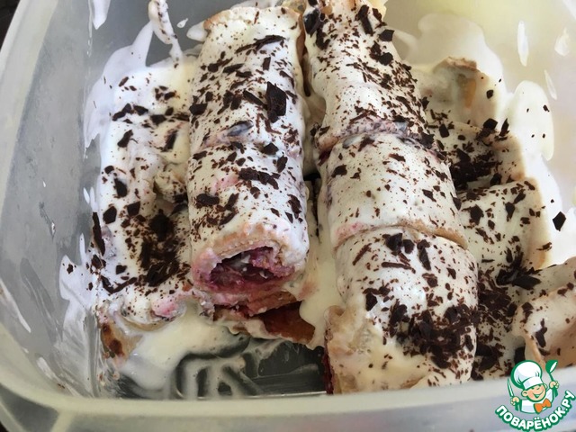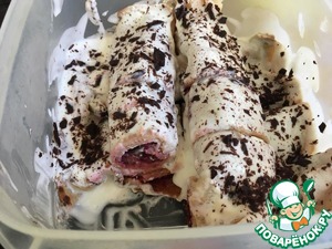 В готовые блинчики заворачиваем подготовленную начинку. 300 гр вишни засыпать 2 ст. л сахарного песка, сок слить. Завернутые блинчики с начинкой укладываем в форму друг к дружке.
