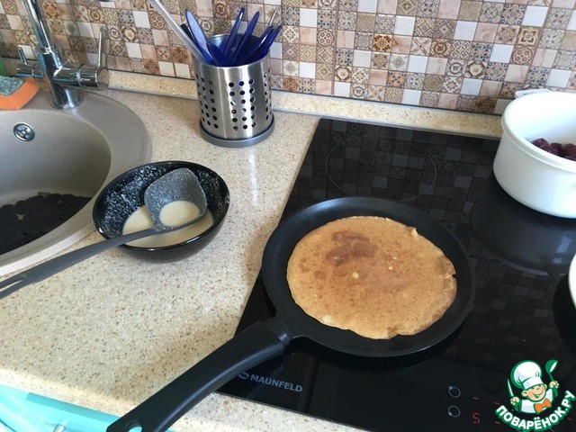 В сыворотку добавляем 1/3 ч. л соды, перемешиваем (чтобы погасить). Добавляем яйцо (1 шт), сахарный песок (1 ст. л). Переливаем промешанную смесь к муке (5 ст. л с горкой), хорошо размешиваем, добавляем пару ст. л оливкового (или растительного масла). Жарим блинчики на среднем огне (для первого блинчика смазываю сковороду каплей масла). -