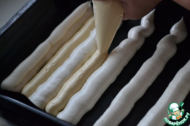 Нанести полоски белкового теста, отступая друг от друга 3 см. -