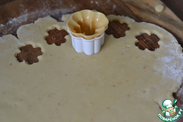 Кусочек теста, который мы оставили в холодильнике, раскатать на прямоугольник. Вырезать формочкой цветочки. -