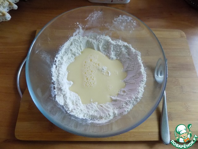 Выливаем яичную смесь аккуратно и вилкой по часовой стрелке начинаем замешивать тесто. Как только тесто возьмёт достаточно муки, начинаем работать руками. Тесто должно к рукам не приставать и быть эластичным. Мукой его забивать не нужно.