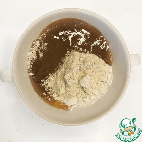 1. Смешиваем муку, миндальную пасту и сироп. -