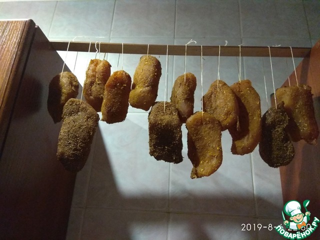 Затем снимаем марлю (но я марлю не снимала, потому что сушила за холодильником), закрепляем филе ниткой и вешаем сушиться в хорошо проветриваемое помещение на 2-4 суток (мы повесили на кухне, за холодильником, на верёвочке)).