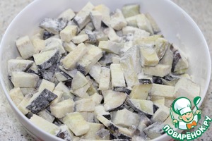 • Нарезать баклажаны кубиками со стороной 2 см, посолить, обвалять в муке