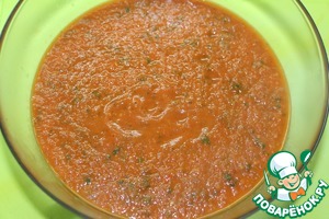 • Готовый томатный соус взбить блендером до однородности, добавить кедровые орехи, рубленый миндаль, еще раз взбить.