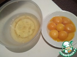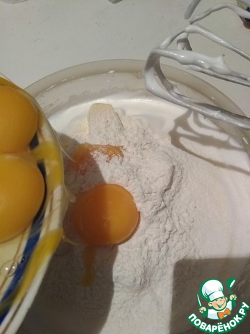 Сверху на белки добавляем кусочками масло, просеиваем муку и желтки.