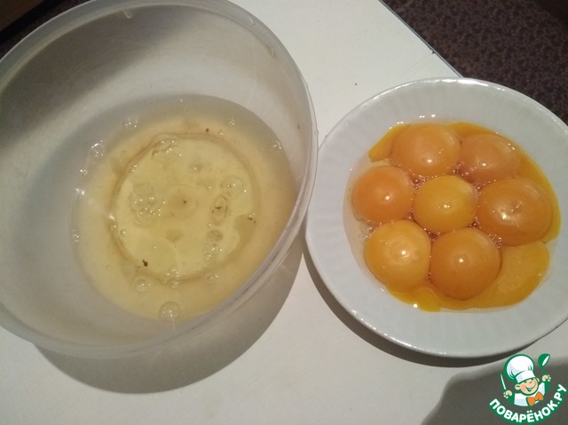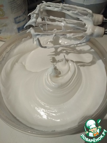 Белки взбиваем до пиков, в середине взбивания добавляем постепенно весь сахар.