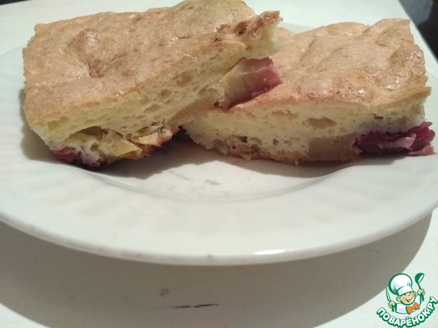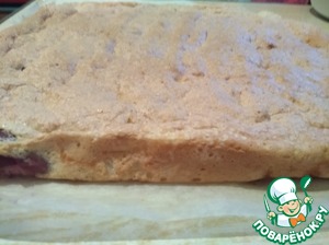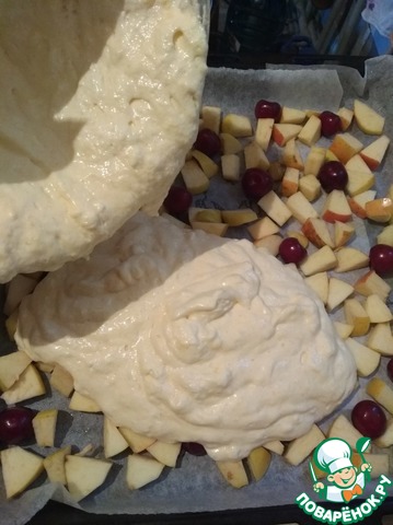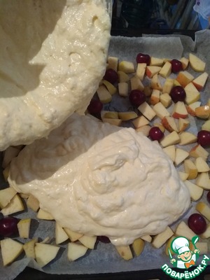 На предварительно подготовленный противень (застеленный пергаментом, смазаным маслом)с порезанными яблоками и черешней (у меня черешня, но вы можете положить вишню или только одни яблоки использовать) выкладываем наше тесто, разравниваем.