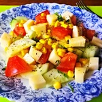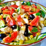 [+5]Таня, сразу заинтриговал Ваш салат! Остановило лишь отсутствие моцареллы. Поехала в магазин -купила всяко разное, а сыр-то забыла!)) но это меня не остановило. Был сыр, по вкусу очень напоминающий моцареллу, но более плотный. Вот никогда бы не додумалась к свежим овощам добавить кукурузу! Это так вкусно! Абсолютно мой рецепт! Базилик был сушенный, салат немного постоял, пропитался и я с таааким удовольствием пообедала! Спасибо большое за новый вкус! Обязательно буду готовить в дальнейшем