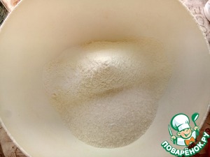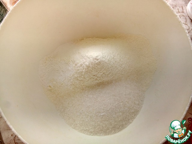 В миску просеять муку с разрыхлителем и содой, добавить сахар, перемешать.