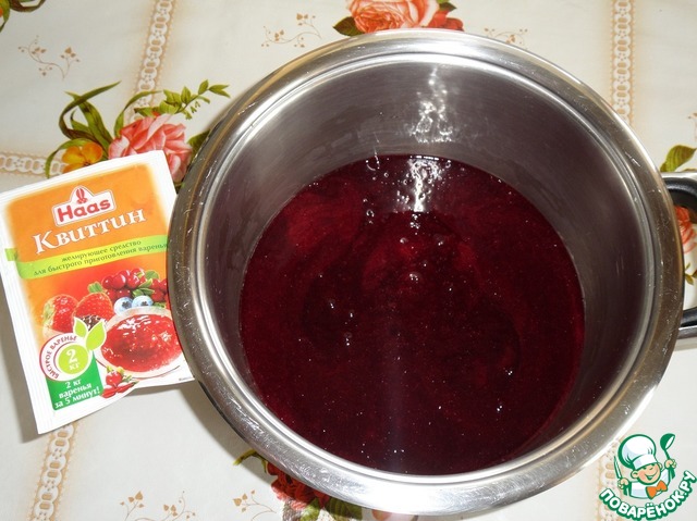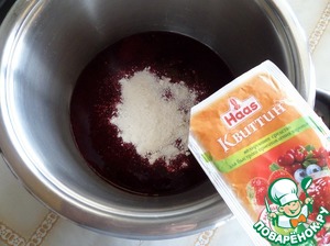 В кастрюлю к ягодному пюре добавляем квиттин ТМ "HAAS". Перемешиваем. Ставим кастрюлю на огонь.