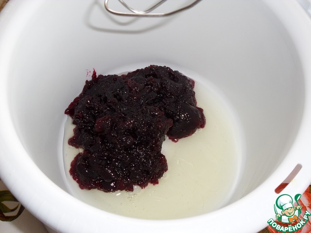 В чашу миксера выкладываем 250 грамм ягодного пюре и 1 яичный белок. -