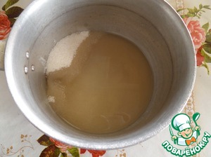 В небольшую кастрюлю выкладываем 220 грамм сахара, 7 грамм агара и наливаем воду. Ставим кастрюлю на огонь.