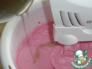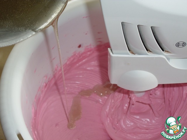 Убавляем скорость миксера до минимальной. В белково-ягодную массу медленно тонкой струйкой вливаем сахарный сироп.