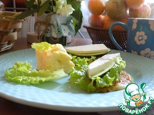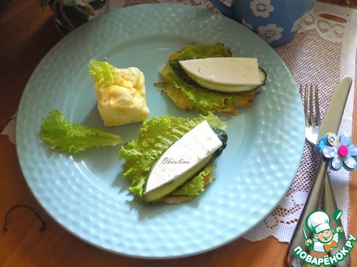 Поверх дранников выкладываем лист салата, далее - дольку огурца, на огурец кладём брынзу-замечательное сочетание!