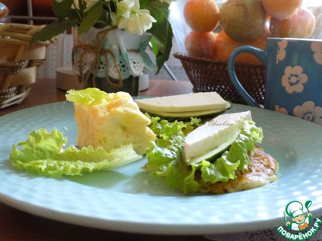 Собираем тосты. Берём тарелку, в которой будем подавать завтрак. Выложила омлет. Вот такой он симпатичный получается. Выкладываем драники. Режем огурцы тонко и по величине подходящей для драников и брынзу.