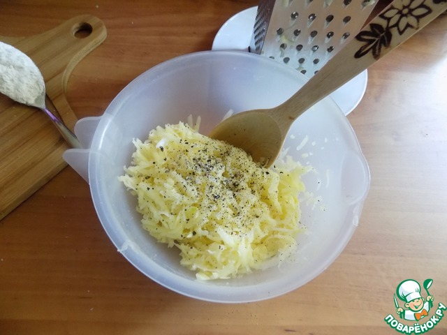 Чтобы картофель не потемнел от металлической тёрки, я всегда сначала натираю лук. Затем к луку натираем картофель. Натираю прямо в ёмкость, где будем смешивать основу для драников. Я использую среднюю величину отверстий у тёрки. Солим и перчим. Перемешиваю деревянной ложкой.