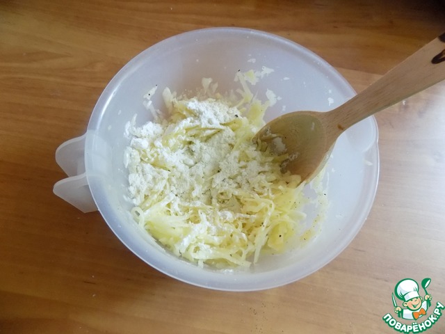 Яиц в драниках не будет и я всегда использую картофельный крахмал. У меня его сегодня не было и я заменила крахмал на цельнозерновую муку. Тщательно всё соединила всё так же деревянной ложкой.